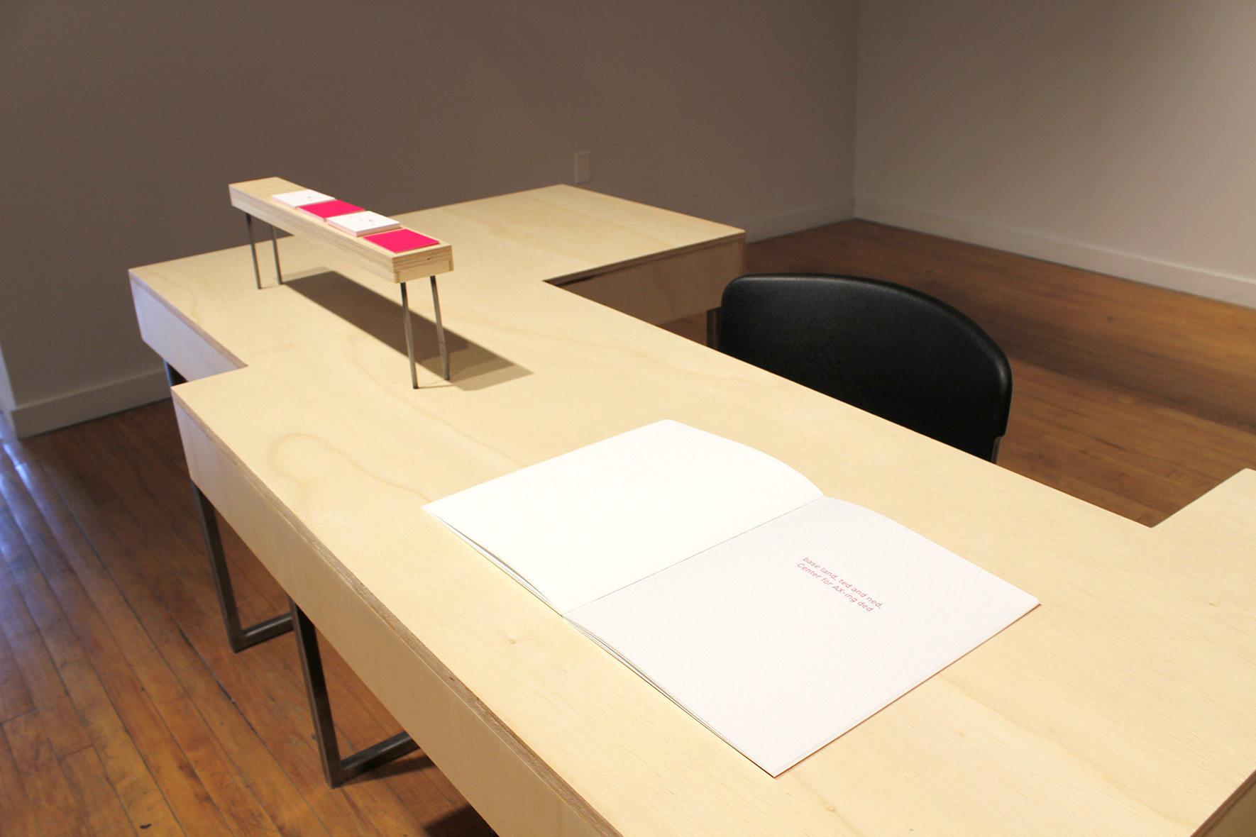 The shape of the top of the desk (G) seen in Front Desk was derived from the shape of the text boxes in my résumé after they had been arranged together to form one complete shape. Installed on the wall directly behind the desk are two pieces (C): the piece on the right (B) is a copy of my original résumé with the shapes of the text boxes denoted in black; the piece on the left (A) is an infographic that shows how the arranged shape of the textboxes was used to fabricate the desk (G). The shape of the logo (D) hanging above the desk was created by layering all the words of my résumé on top of each other. The words on the business cards (E) were taken from the contact information found on my pre-existing business card. The series of poetic phrases found in the pamphlet (F) were formed from specific words extracted from my original résumé. During the initial opening of Career Fair at the Des Lee Gallery in St. Louis, MO, I networked with gallery visitors (H), offering a overview of my qualifications, as well as my business card.